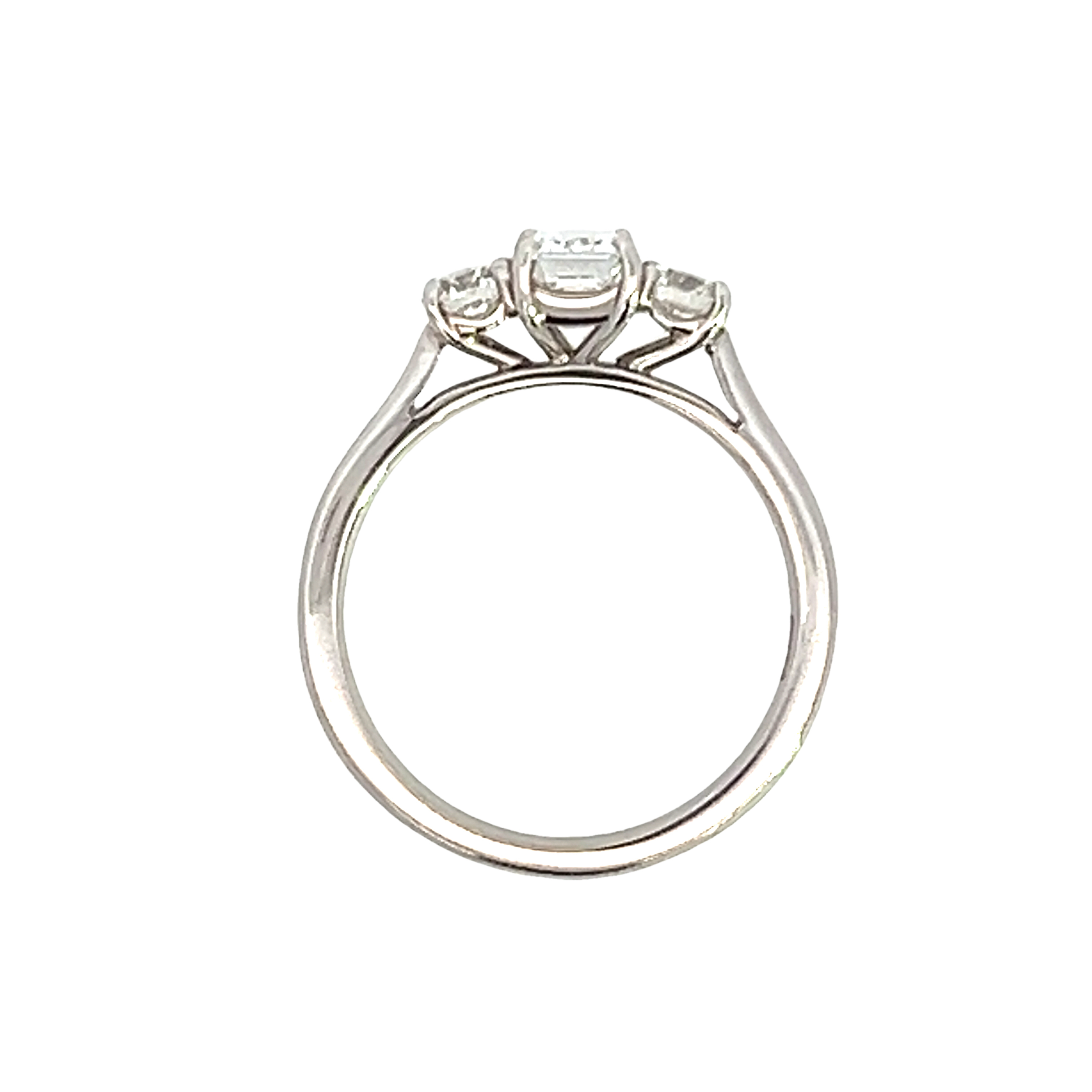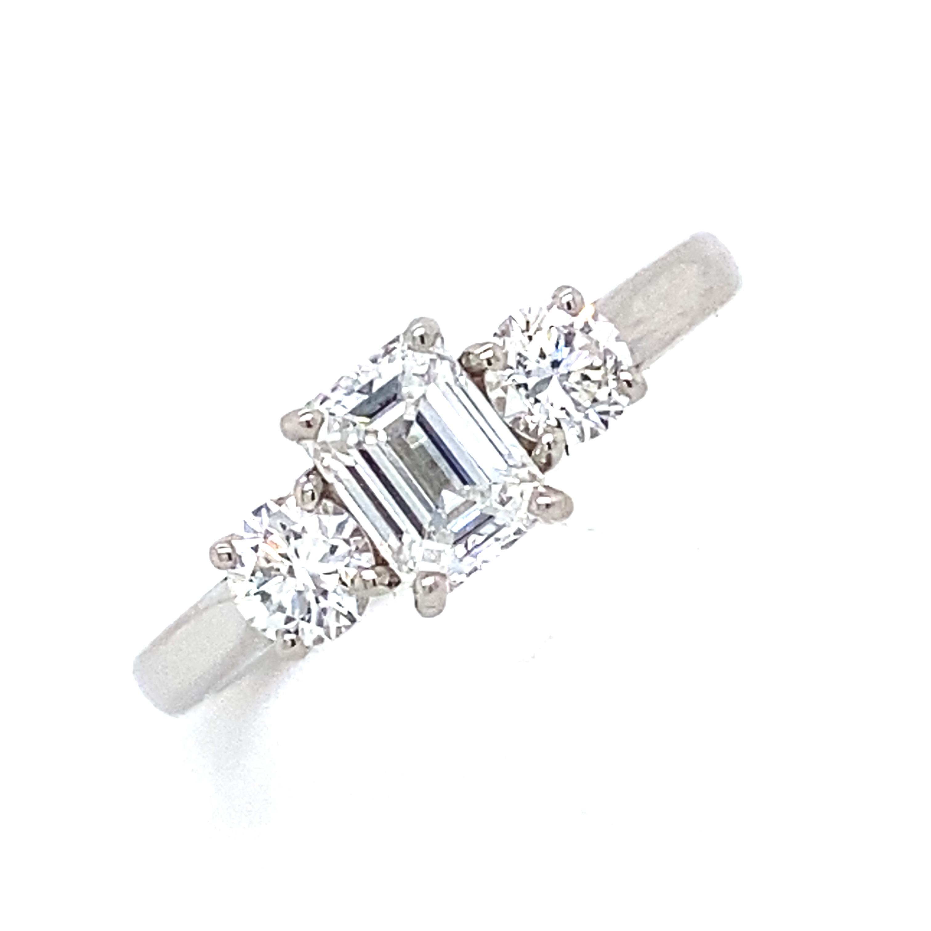 A modern platinum and diamond 3 stone engagement ring. Featuring a centrally set emerald cut diamond certified by the GIA as 0.76 carats F colour VS2 clarity. The side stones are modern round brilliants 0.23 carats each and also certified as F colour VS2 clarity. To a wed fit tapered court shank. Finger size M Total Diamond Weight 1.22 Carats