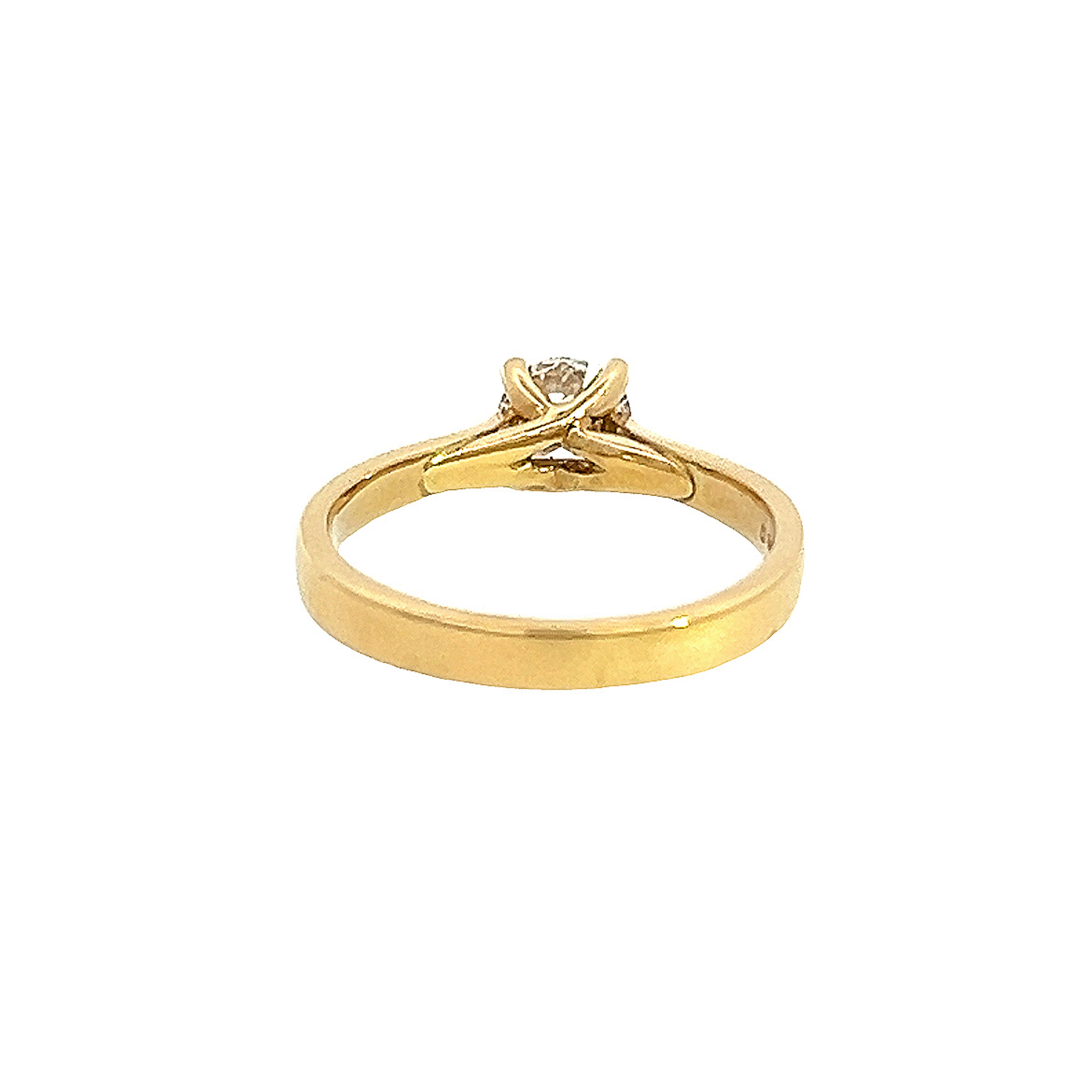 A Modern 18 Carat Yellow gold and Diamond ring from our Lillian collection. Featuring a 4 claw set modern round brilliant diamond in a cross over under wire setting with open shoulders to a slightly tapered heavy court shank. The centre stone is a 0.72 carat HVS1 IGI certified round brilliant diamond. Finger size M