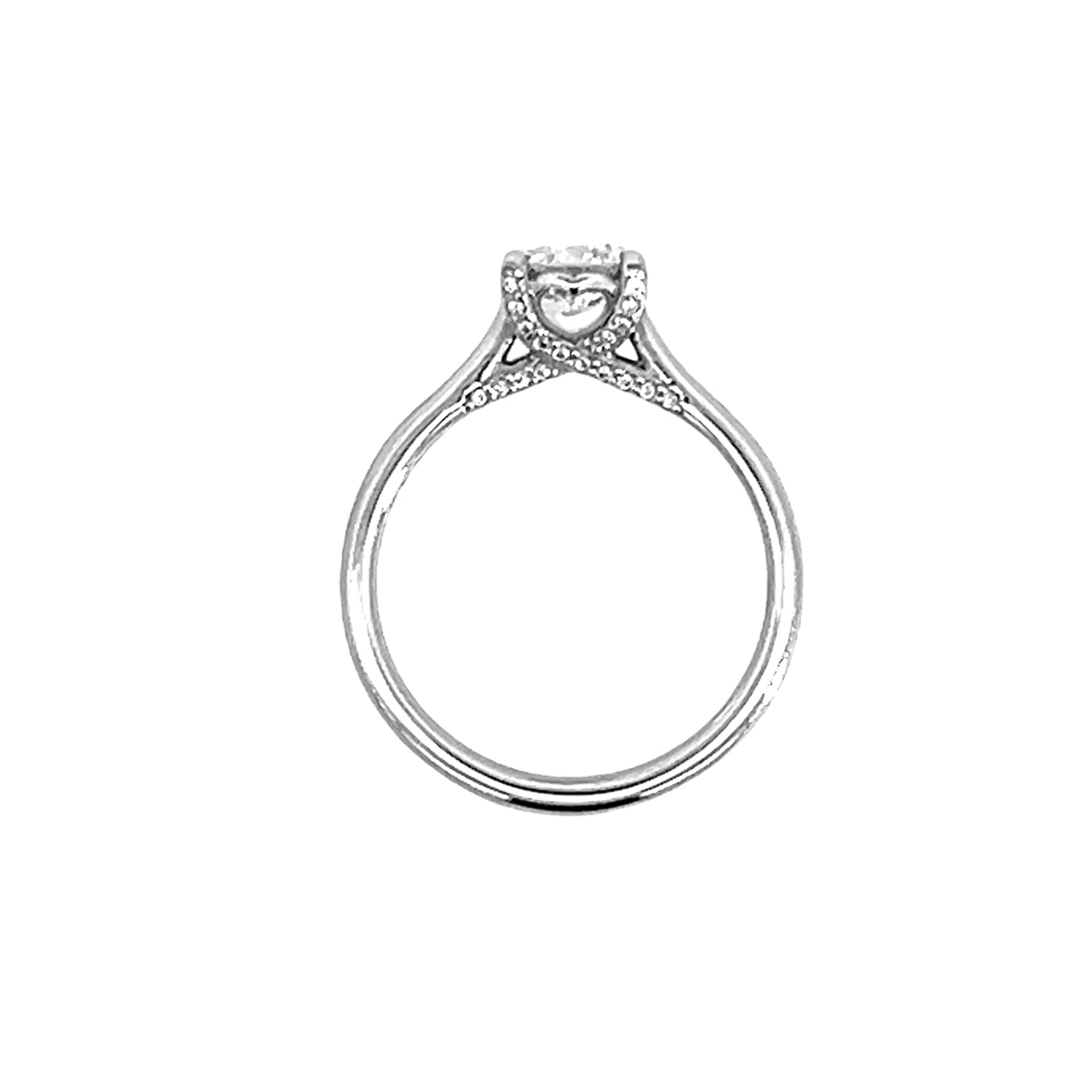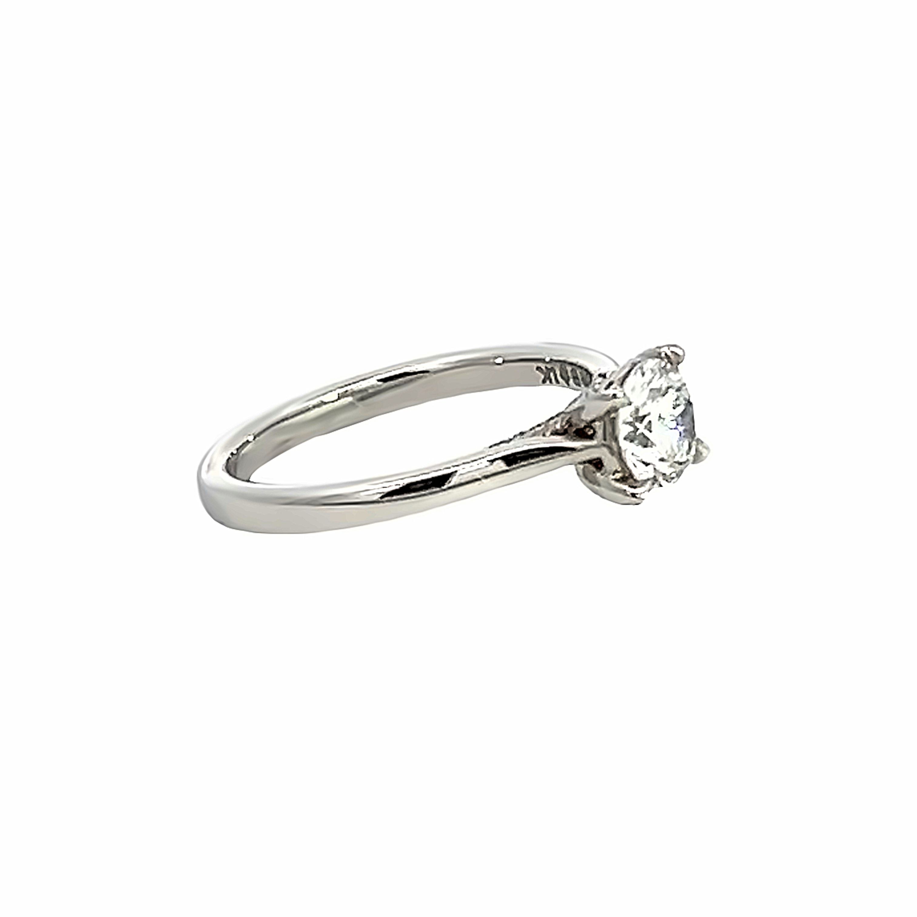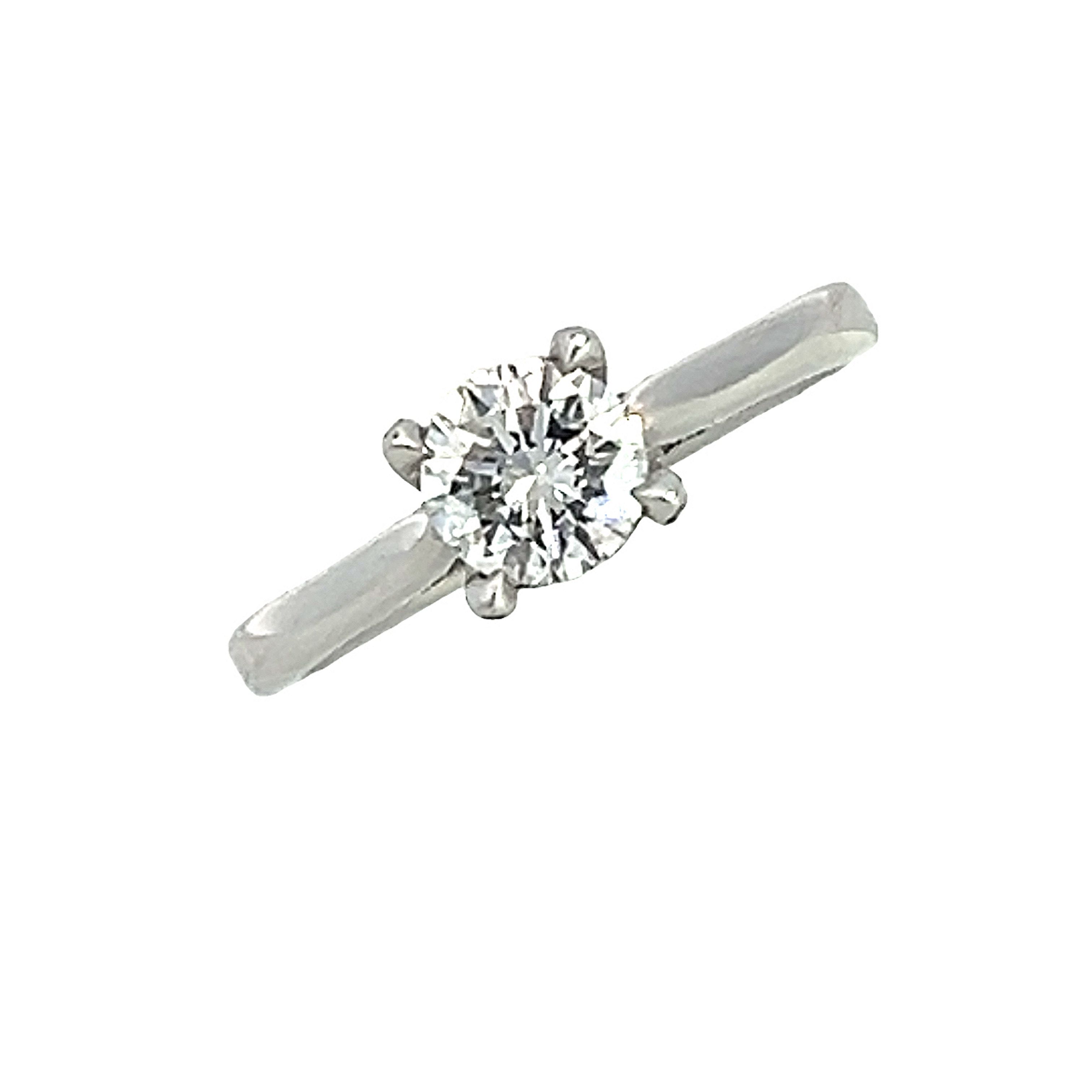 A modern platinum and diamond ring from our Constellation-Cygnus range. Featuring a certified 0.70 carat modern round brilliant cut diamond weighing 0.70 carats of E colour Si1 clarity. Set in a 4 talon claw wed fit setting with a heart shaped gallery with diamond set cross over under wires under the head. To a tapered court shaped 2.3mm shank. Finger size M Gross weight 4.61 Grams