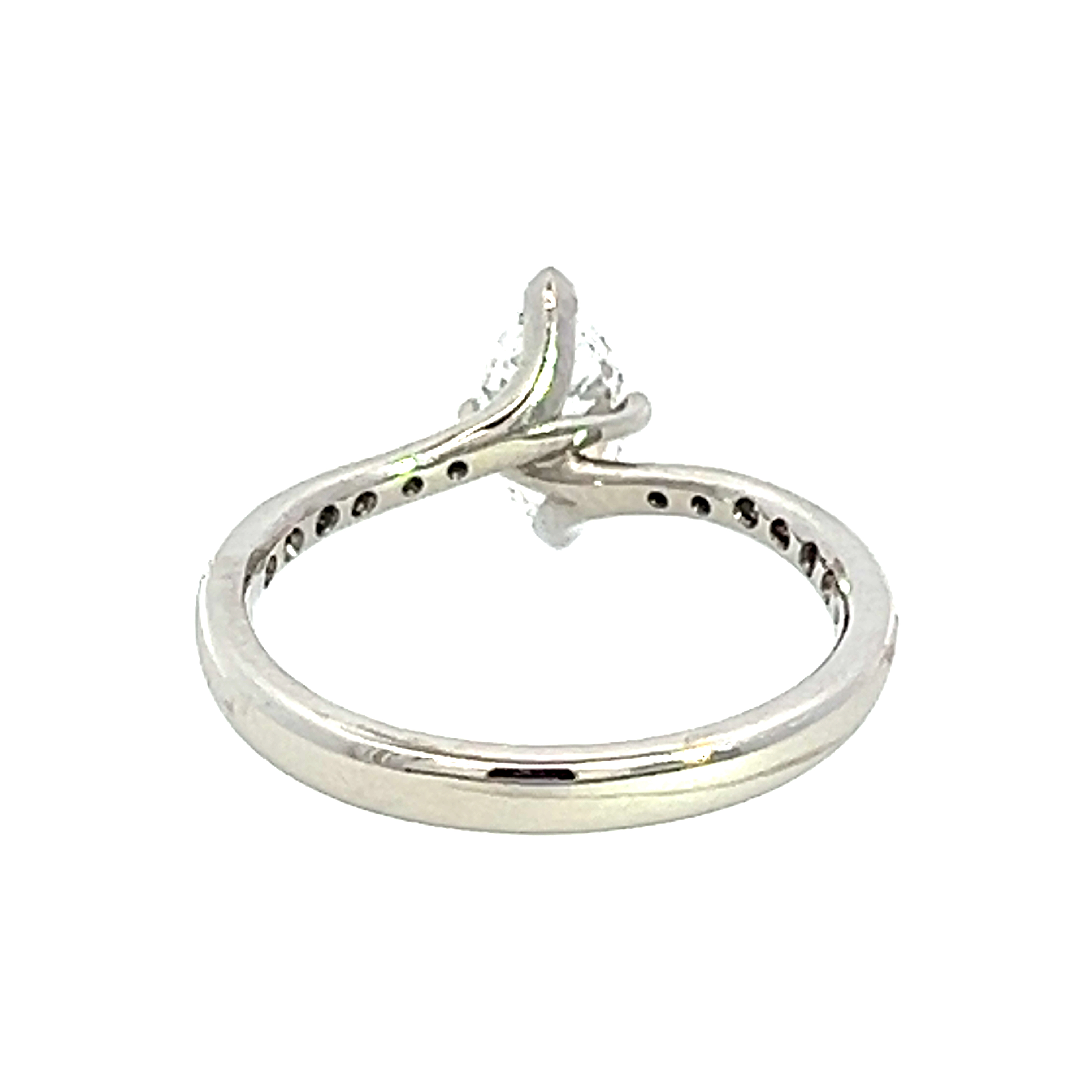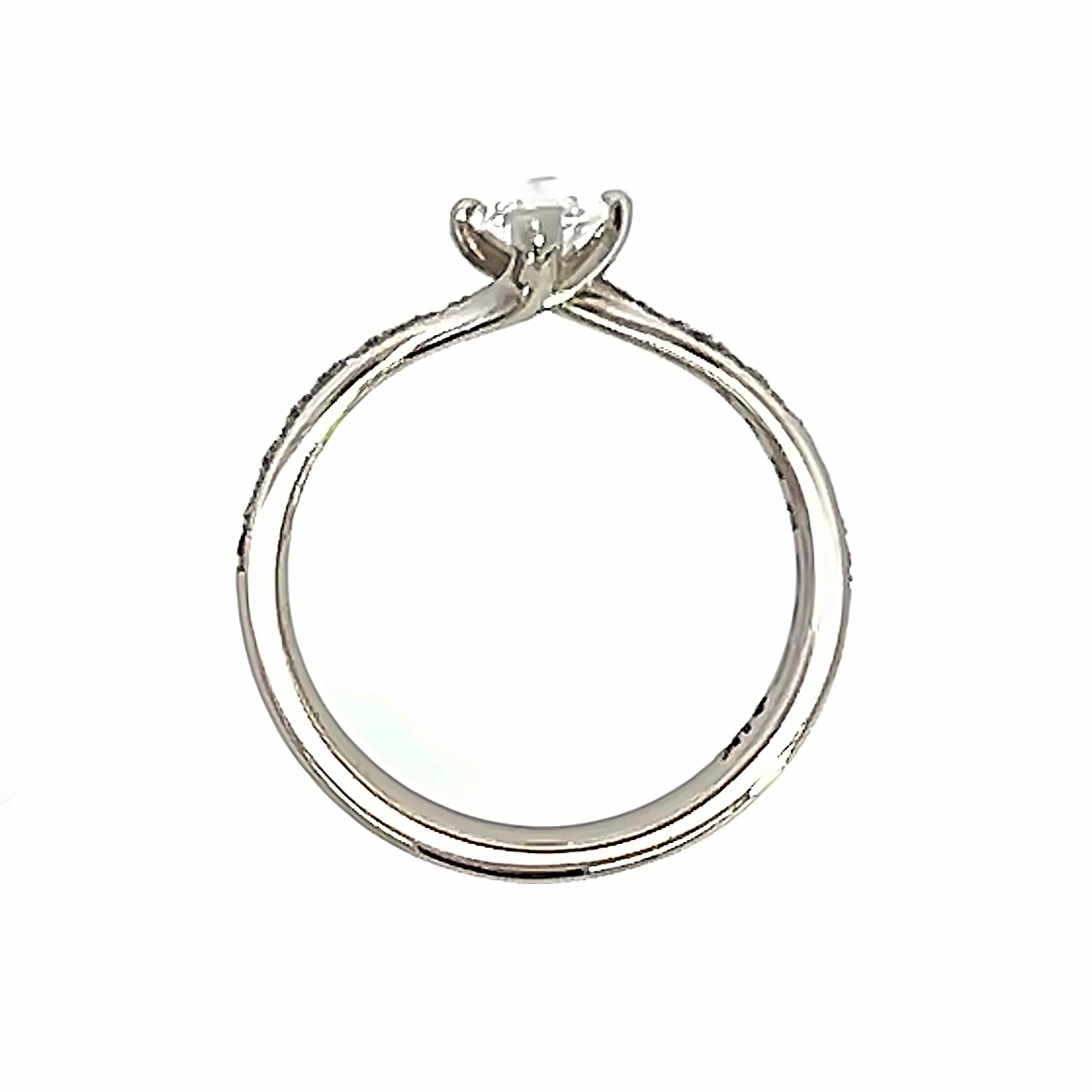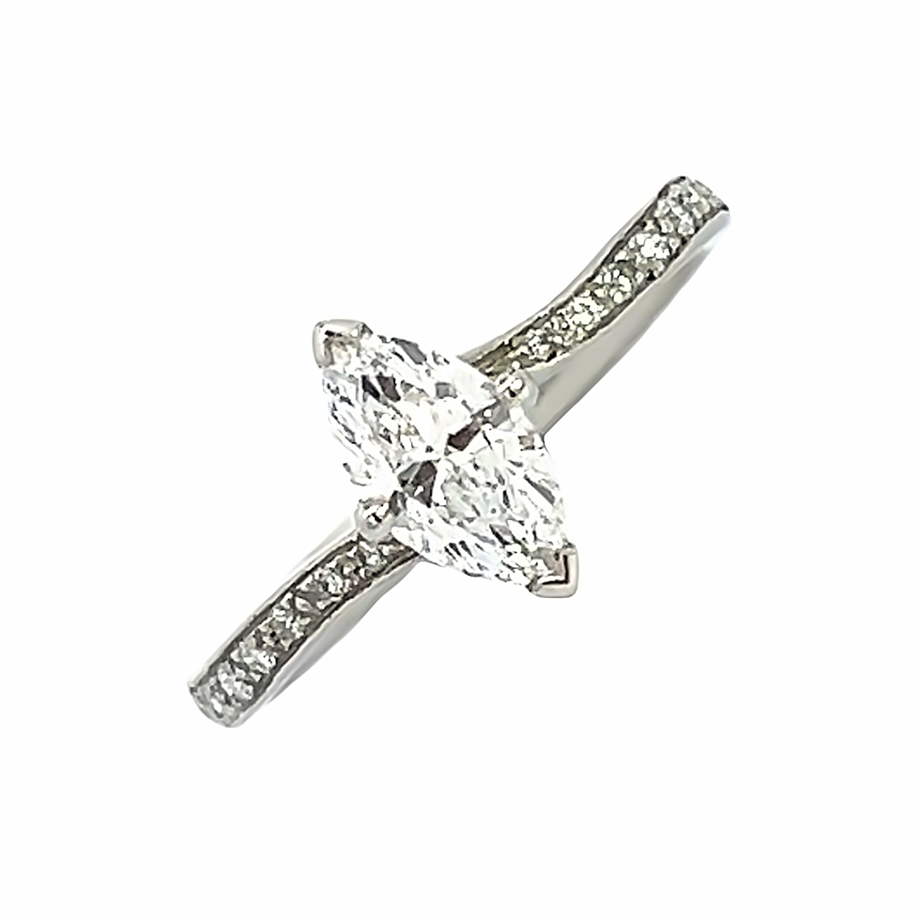 A Modern platinum and diamond 4 claw engagement ring. Featuring a GIA certified marquis Shaped diamond weighing 0.72 carats of D colour SI1 clarity in a 4 claw twist setting with 7 graduated diamonds set into each shoulder in grain settings to a tapered 2.55mm court shank. Finger Size N Gross weight 4.34 grams