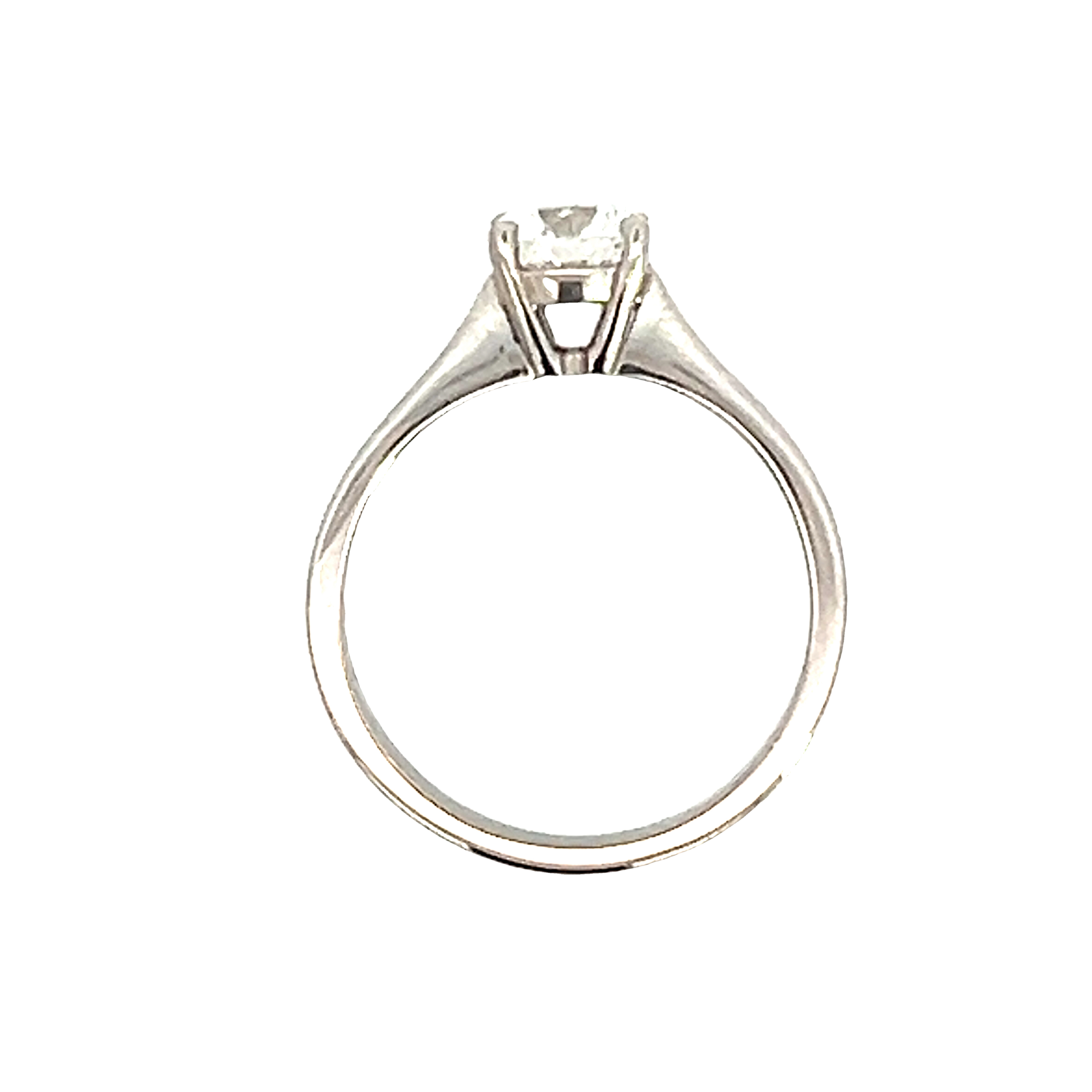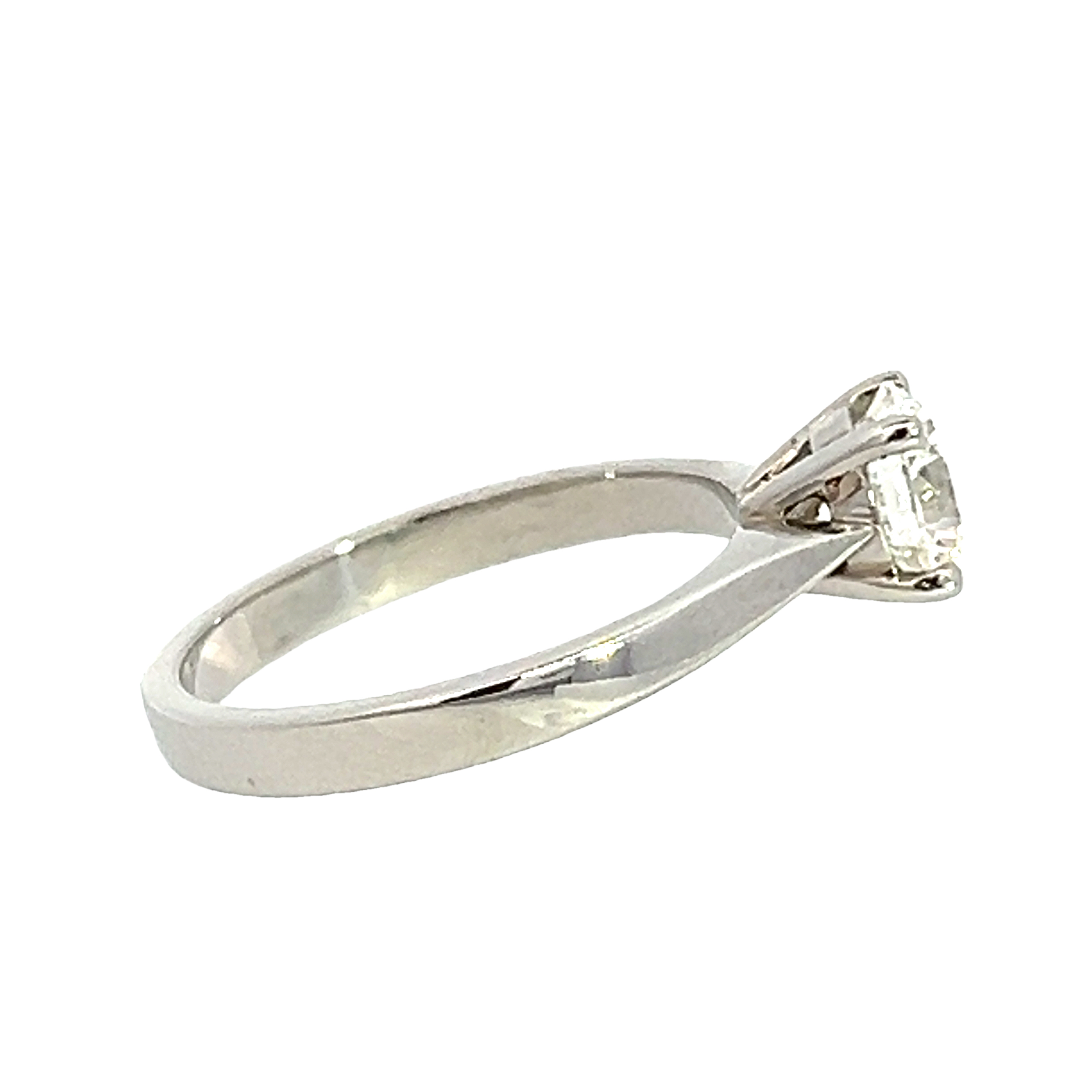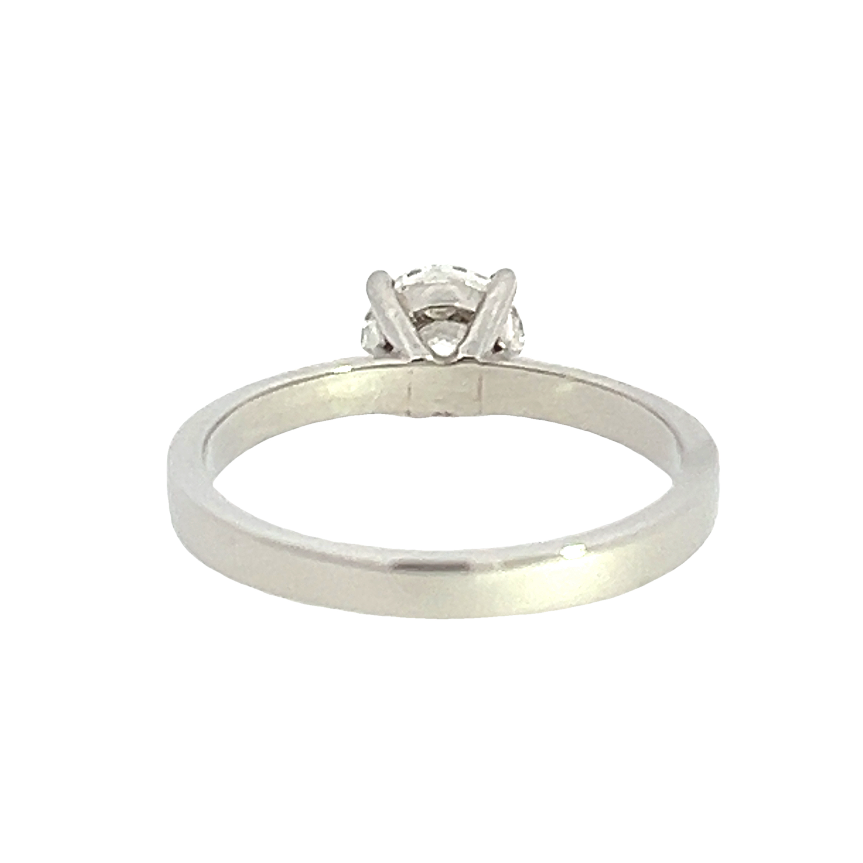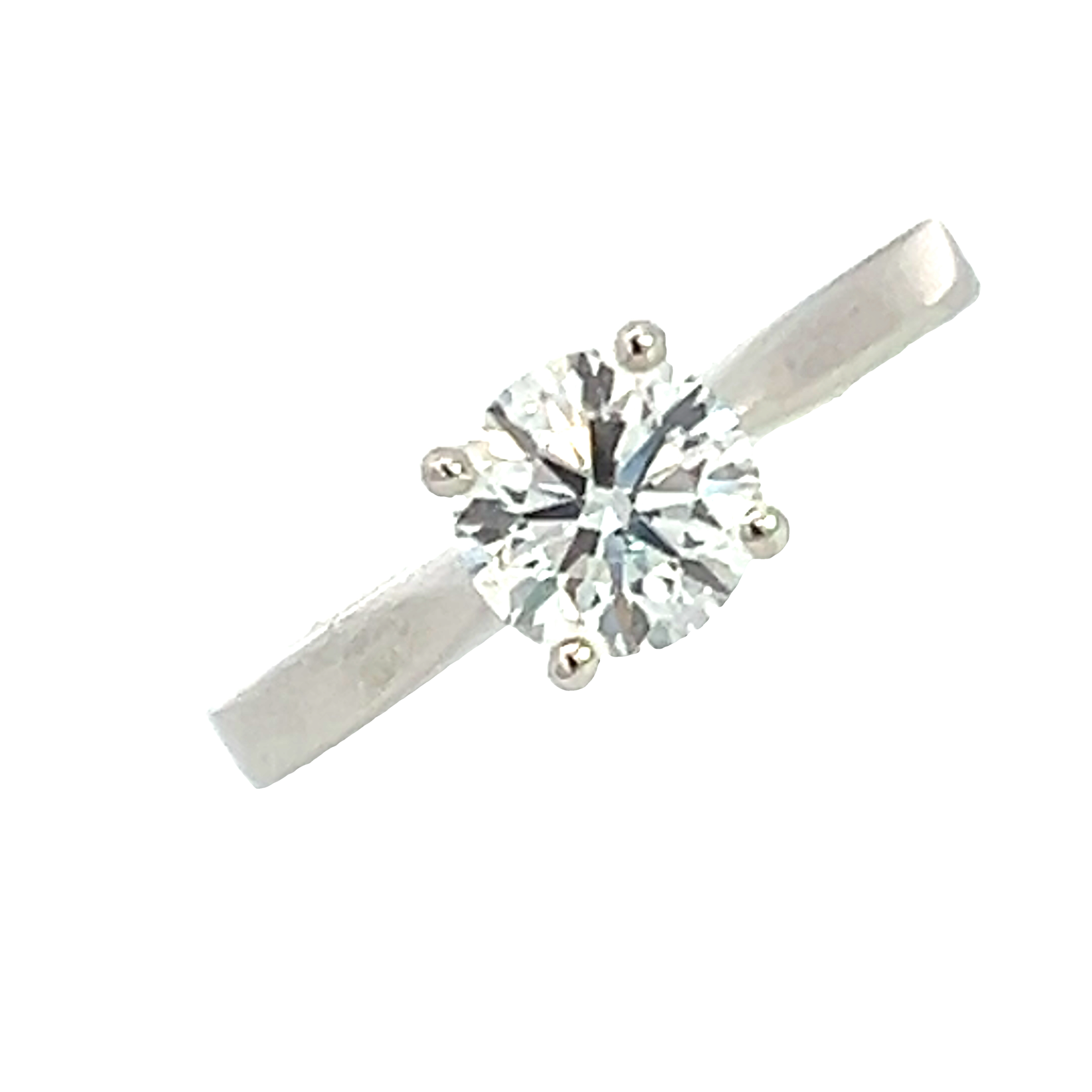 A modern platinum and diamond single stone engagement ring from our 'Doris' collection. Featuring a modern round brilliant 1.00 carat diamond certified by the GIA as G colour Si1 triple excellent. Set in a four (4) claw double gallery setting to a 2.40mm tapered Flat band shank with solid shoulders. Finger size M Gross weight 4.59 grams