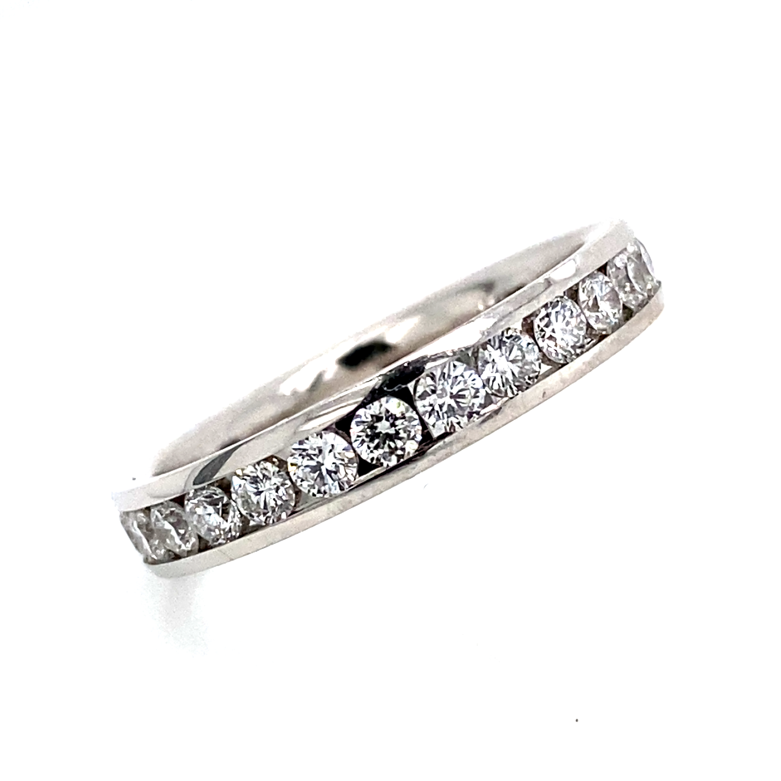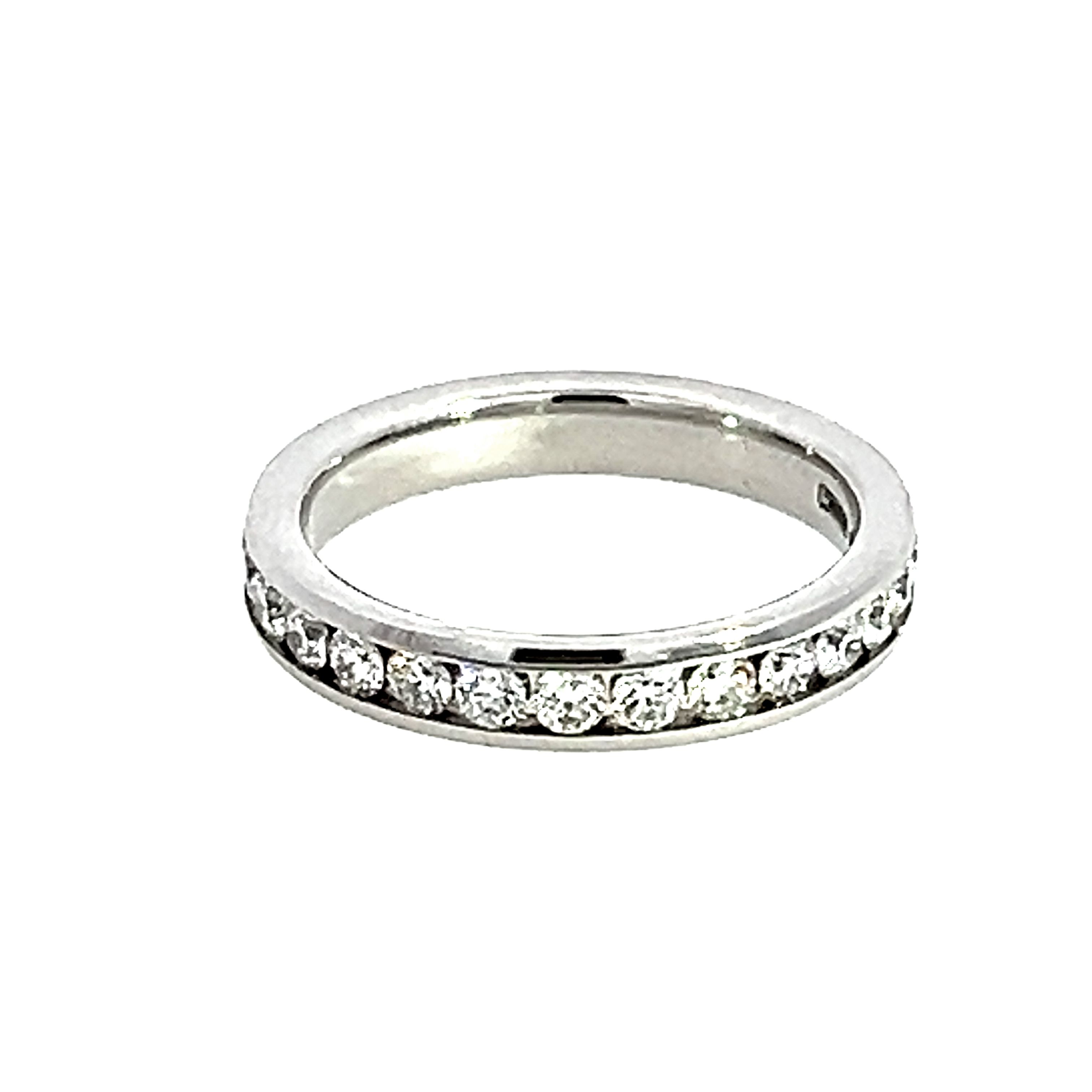This Platinum Full Eternity Style Ring has 1.08 Carats of G colour VS Clarity modern round brillaint Diamonds channel set in a platinum setting. Size L