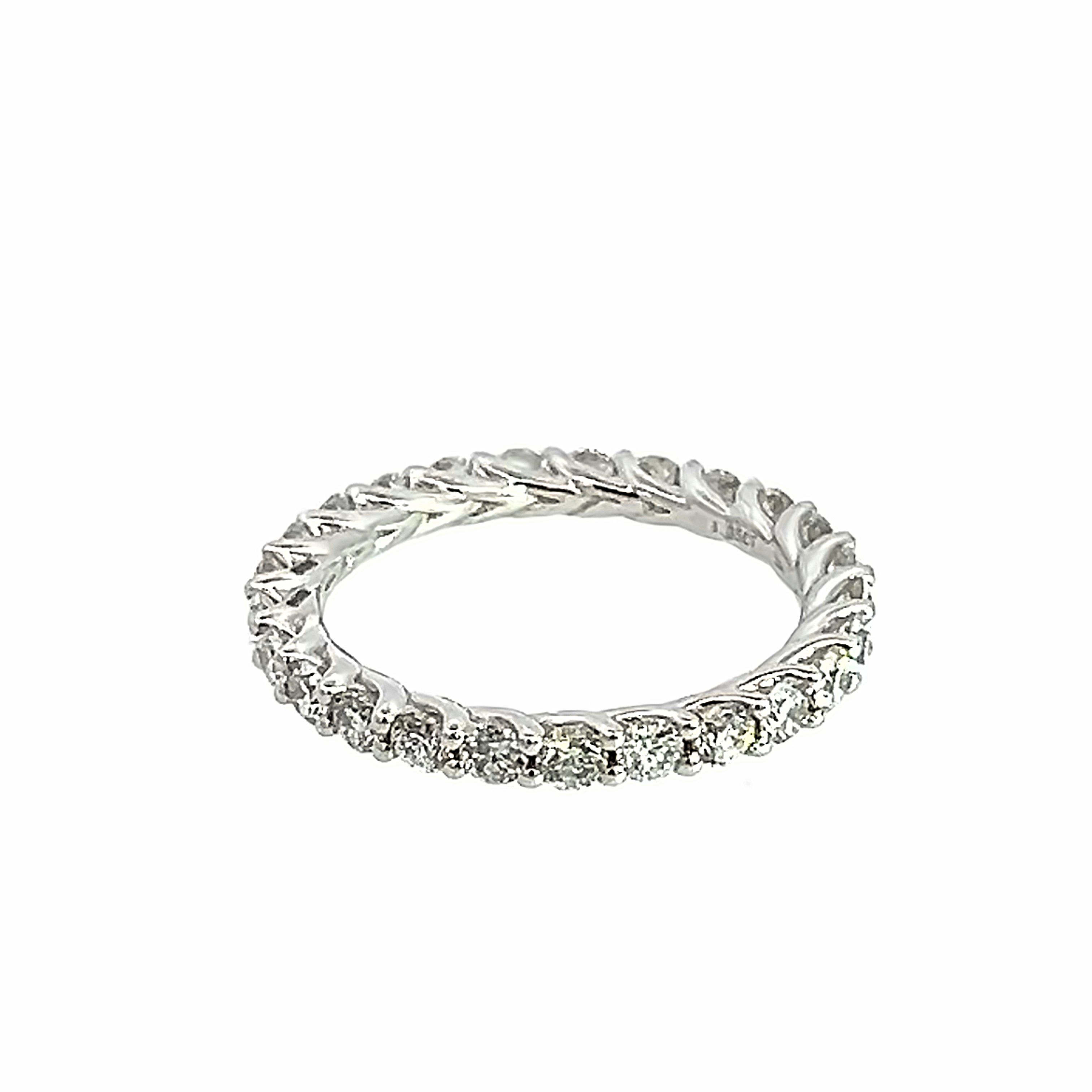 A modern platinum and diamond full eternity ring - featuring 25 modern round brilliant diamonds with a total carat weight of 1.35 Carats of G colour VS clarity in shared claw settings with a wave style under wire. Finger size M Gross weight 3.5 Grams