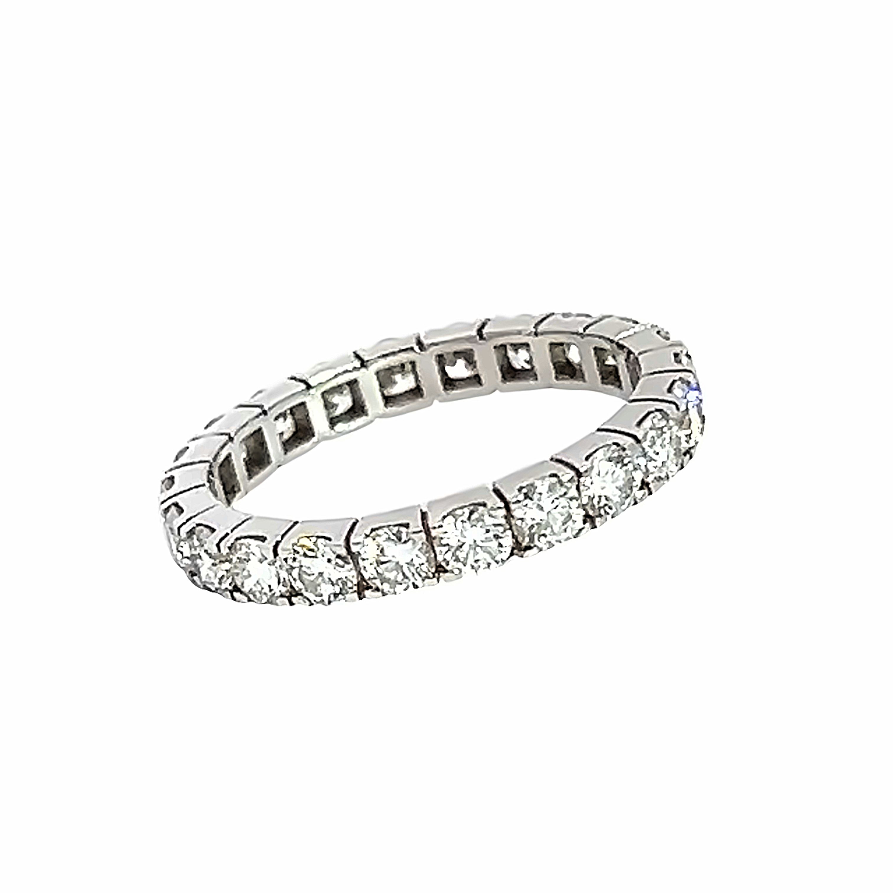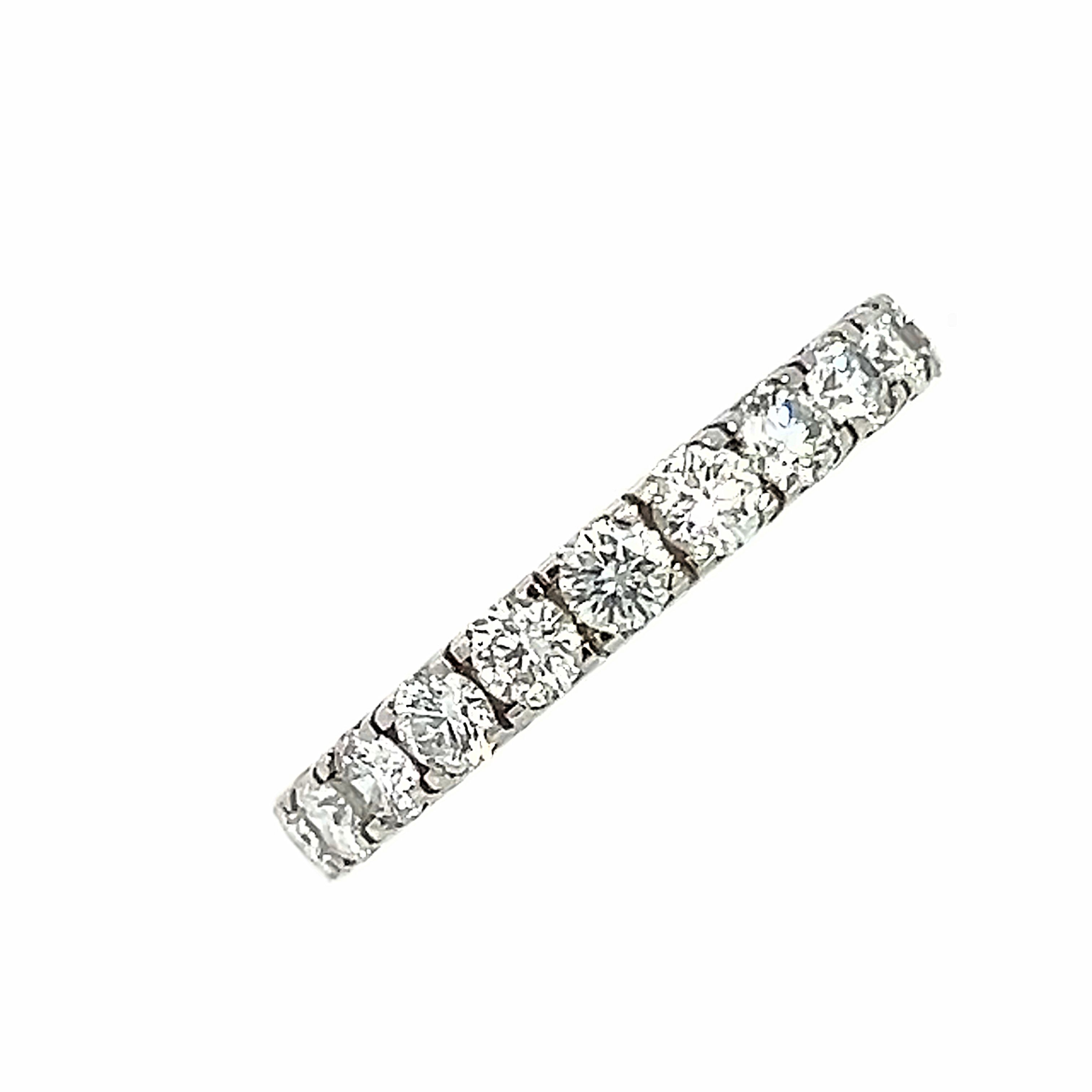 This full diamond band is beautifully detailed with 4 fine claws in castle style setings on each round brilliant diamond set in 18 carat white gold. The 2.04 carats of diamonds are G colour VS clarity it weighs 3.4 grams and is approximately 3.3 mm wide. Size N This ring sits beautifully low to the finger.
