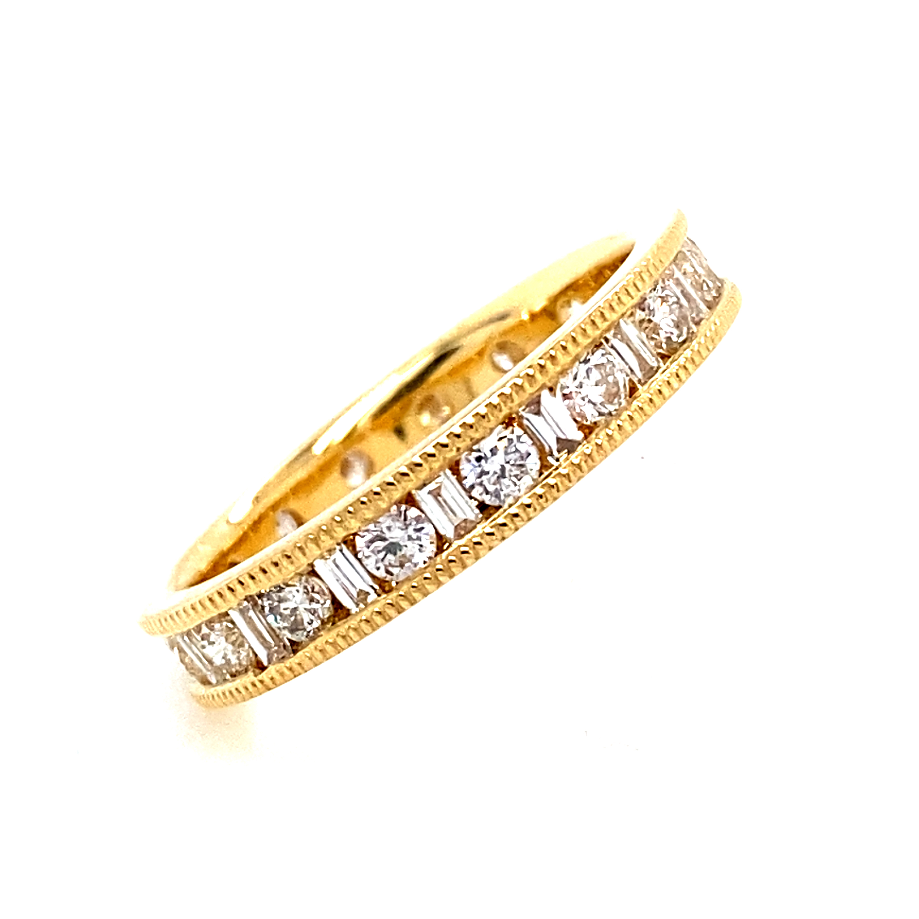 A modern 18 carat yellow gold channel set eternity style ring. Featuring alternately set with 1.00 carats of round brilliant and baguette shaped G colour VS clarity Diamonds set in a channel setting with milgrain detail to the edge. Gross weight 3.4 grams Overall width 3.5mm. Finger size M
