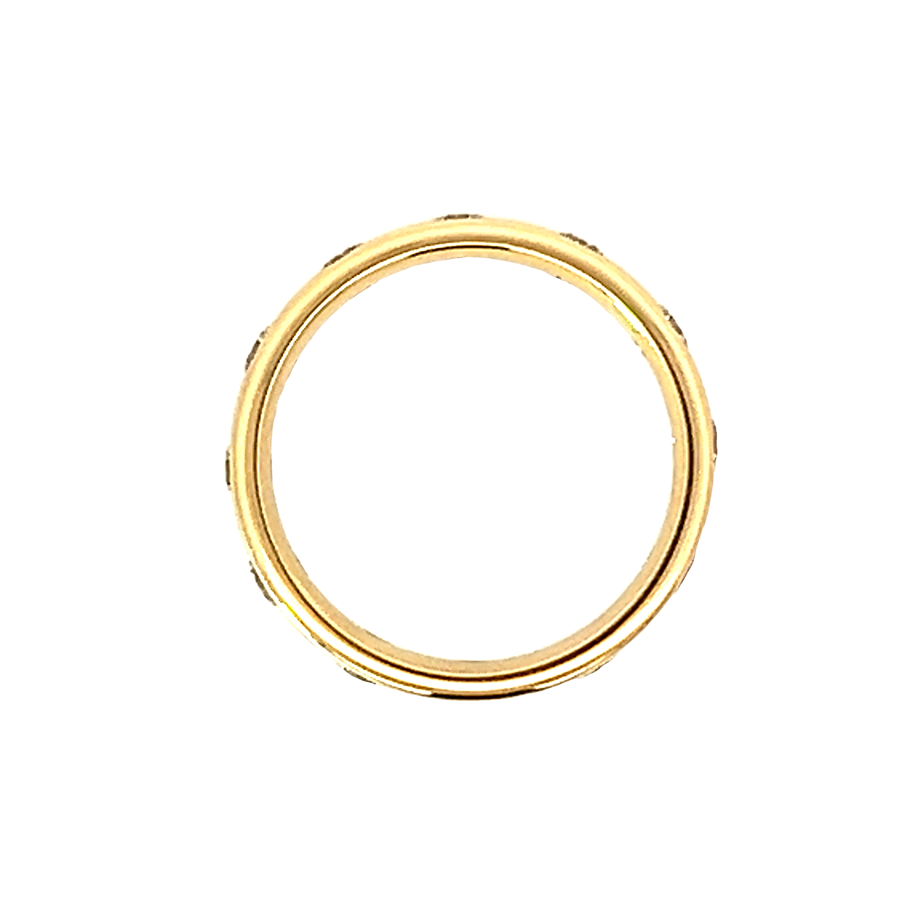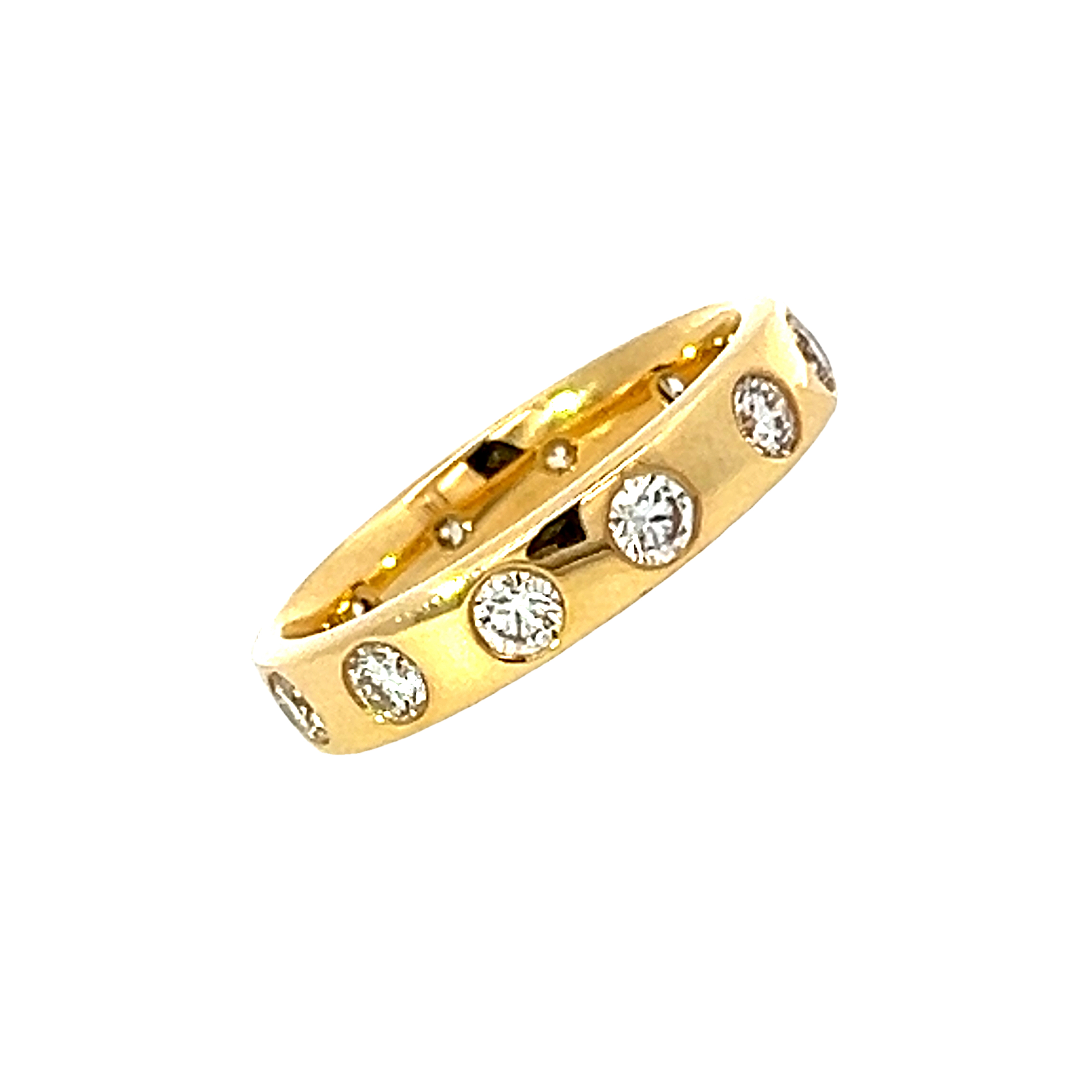 A modern 18 carat yellow gold and diamond flush set 4mm flat court band ring. Set with 12 modern round brilliant diamonds evenly spaced around the ring. Total diamond weight 1.00 carats of F/G colour VS clarity diamonds. Weight 4.81 Carats Finger size M