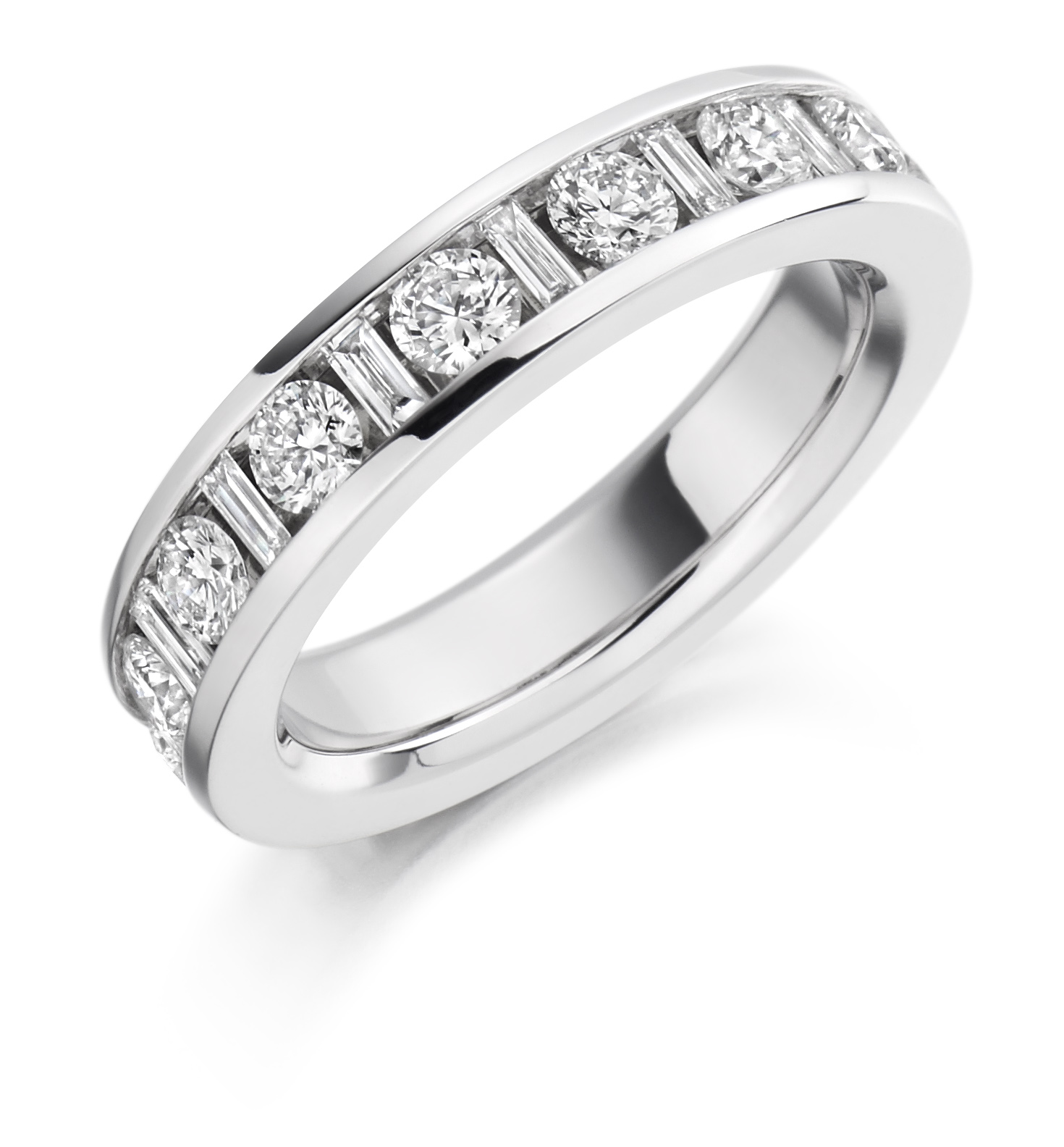 This 18 carat white gold ring is made with alternate Round Brilliant and Baguette diamonds and is fully channel set with 1.50 carats of G colour and VS clarity diamonds. The ring weighs 5.5 grams and is approximately 4.0 mm wide and 2.5mm deep. This ring is a size N. However as we hand make all our jewellery the finger size metal type carat weight colour and clarity of the diamonds can be changed to your specification. Normally bespoke pieces take 3-4 weeks to make from receipt of order. It costs no more for us to make a bespoke piece for you than we would charge to put it on the shelf in store. If you are going to order an eternity ring in a specific size without having your finger sized in store by the Marmalade Team then please be aware that there will be an additional charge to re-make or resize the ring should it need so in the future. All Marmalade diamonds are independently certified and guaranteed conflict fee.