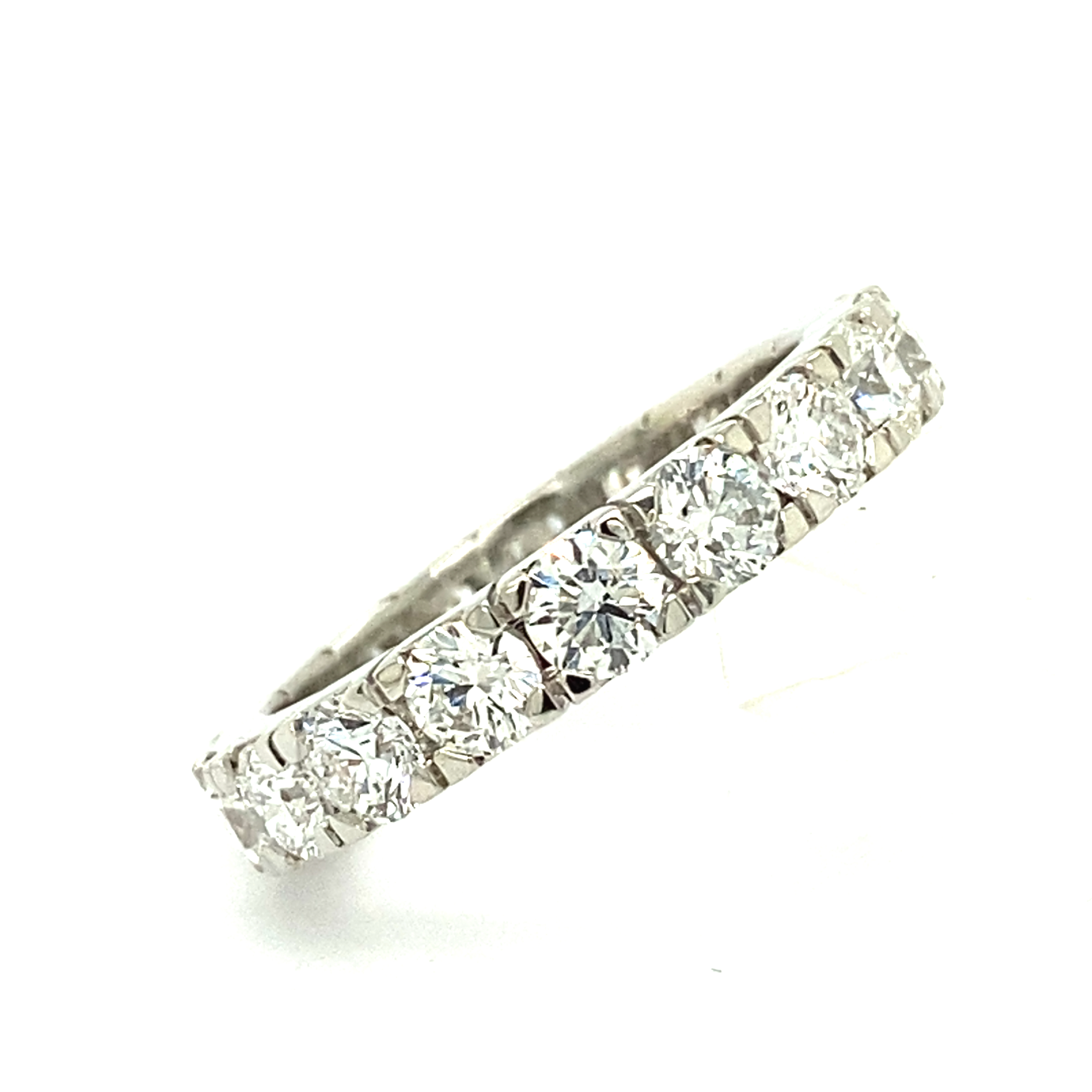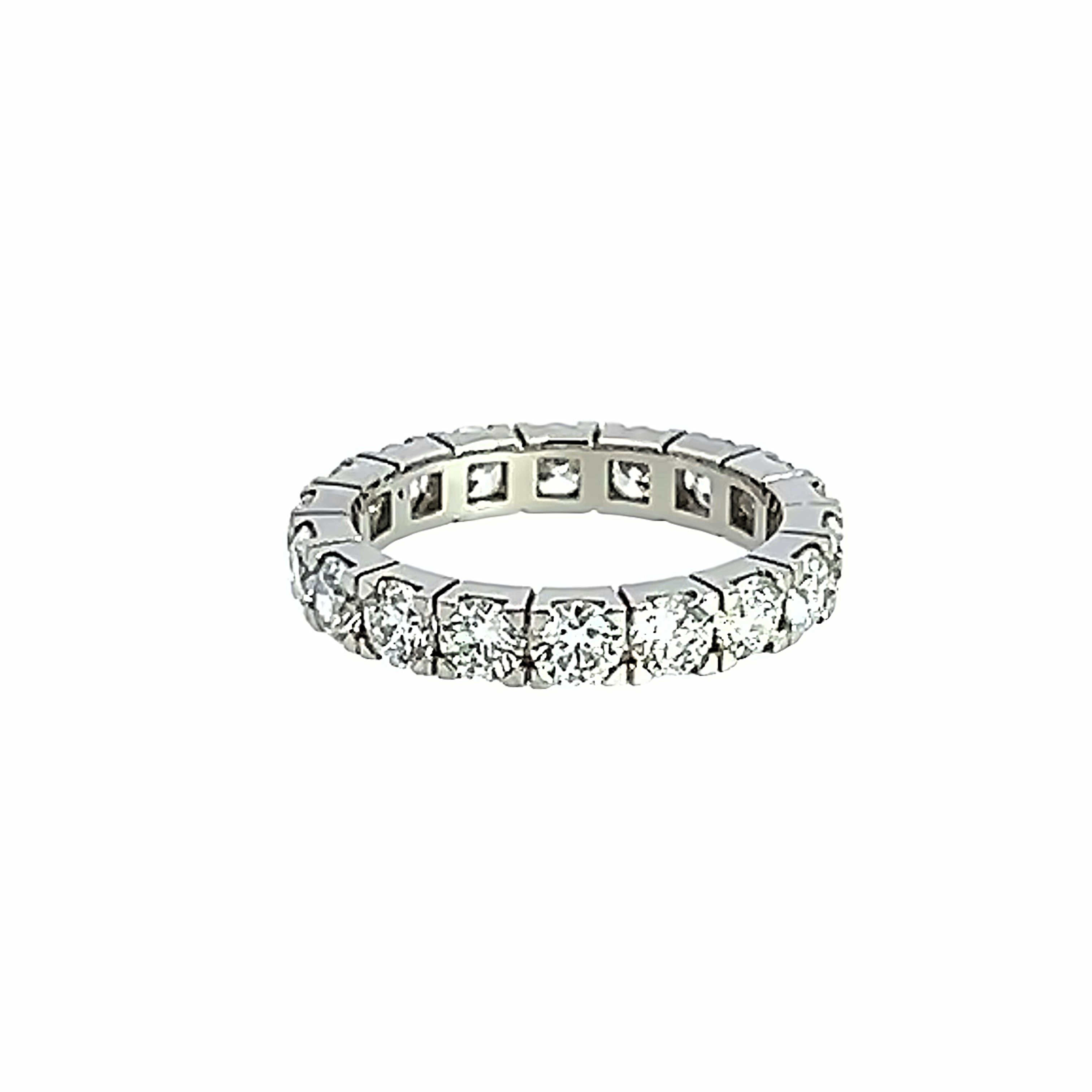 A modern platinum and diamond full eternity ring featuring 18 modern round brilliant diamonds of F/G Colour VS clarity and individually weighing 0.15 carats - giving a total diamond weight of 2.70 carats in 4 claw castle style settings. Finger size M Gross weight 5.2 Grams Overall width 3.50mm