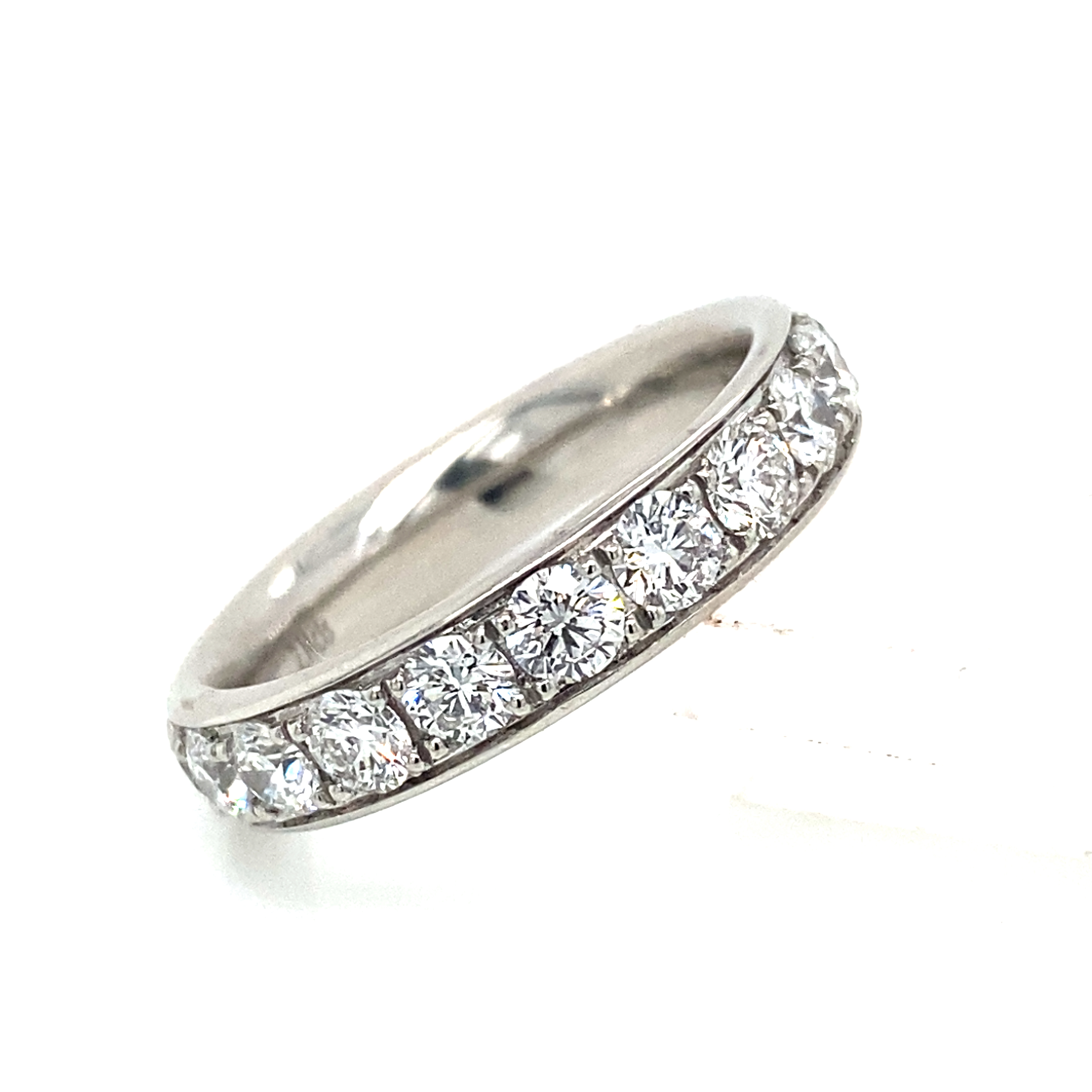 A modern platinum and diamond eternity ring featuring 2.25 carats of modern round brilliant diamonds grain set into platinum. 4.2mm wide Size N