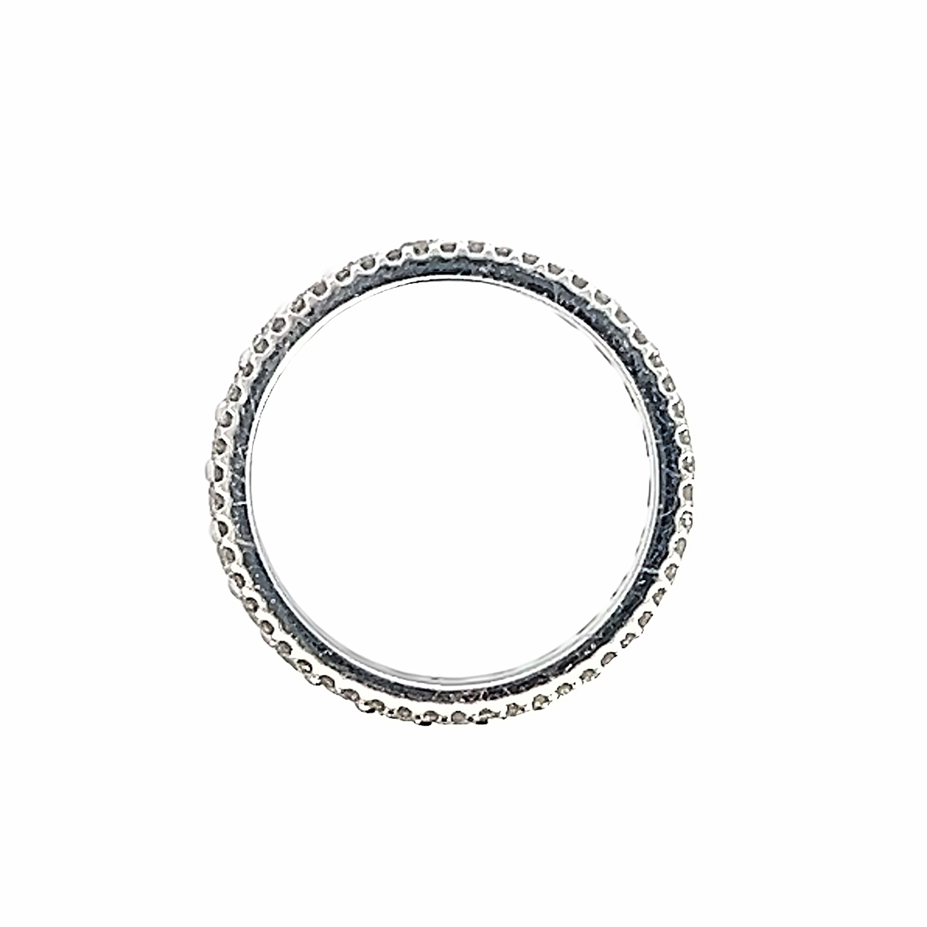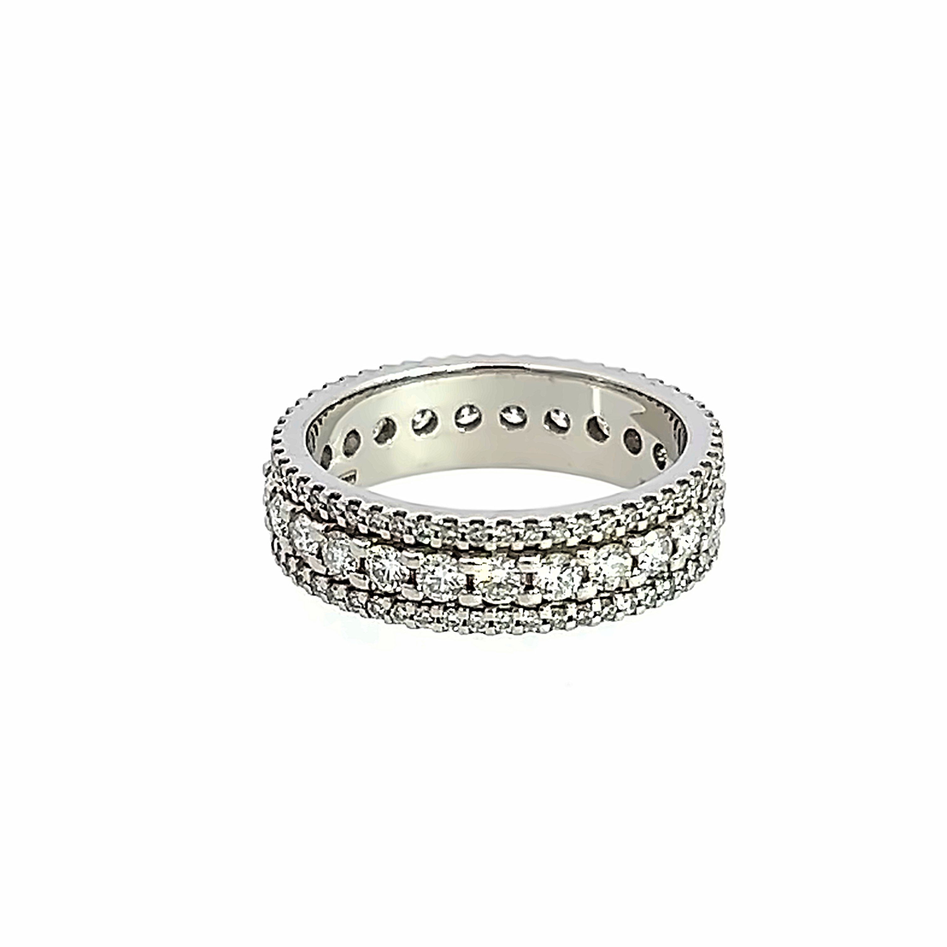 This ring is made using 1.44 carats of brilliant cut diamonds claw set in 3 rows it is in 18 carat white gold and fully set with G colour VS clarity diamonds it weighs 6.4 grams and is approximately 5.5mm wide. Size N All Marmalade Diamonds are independently certified and guaranteed conflict free.