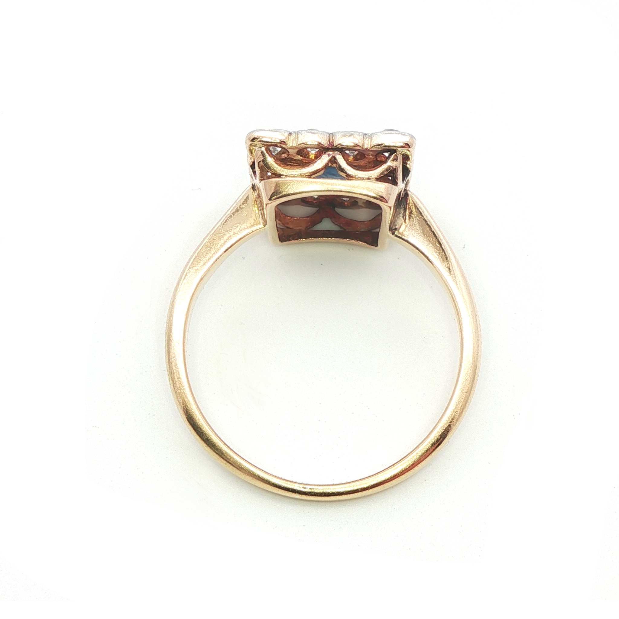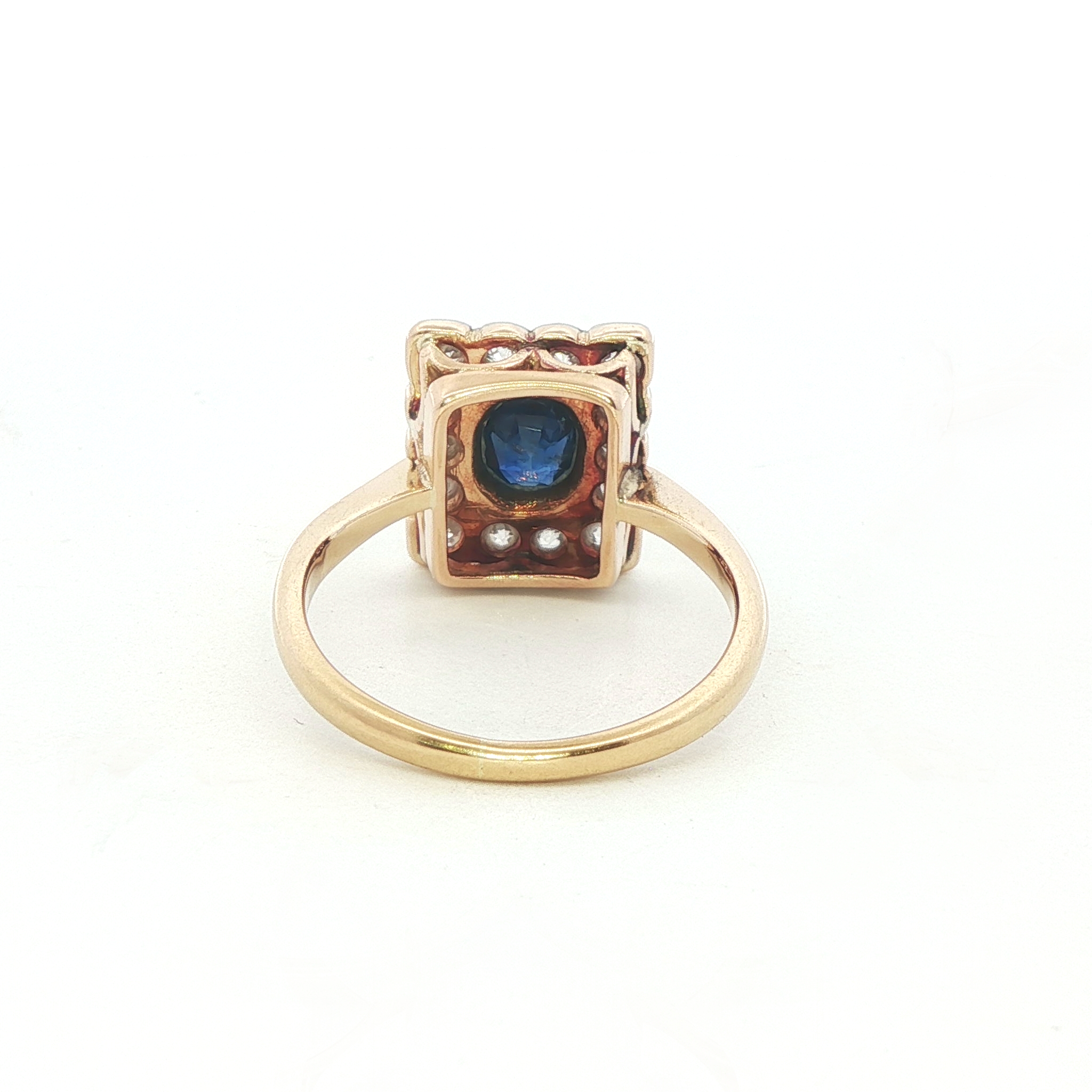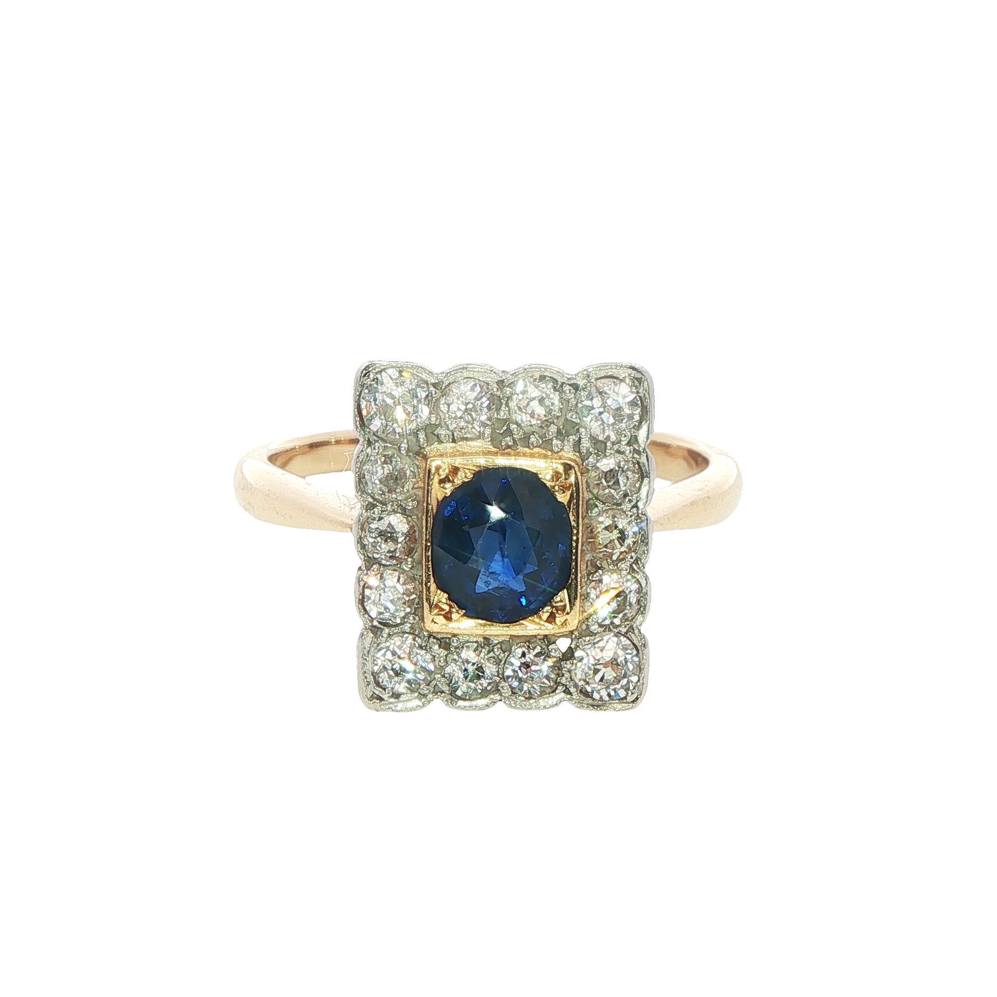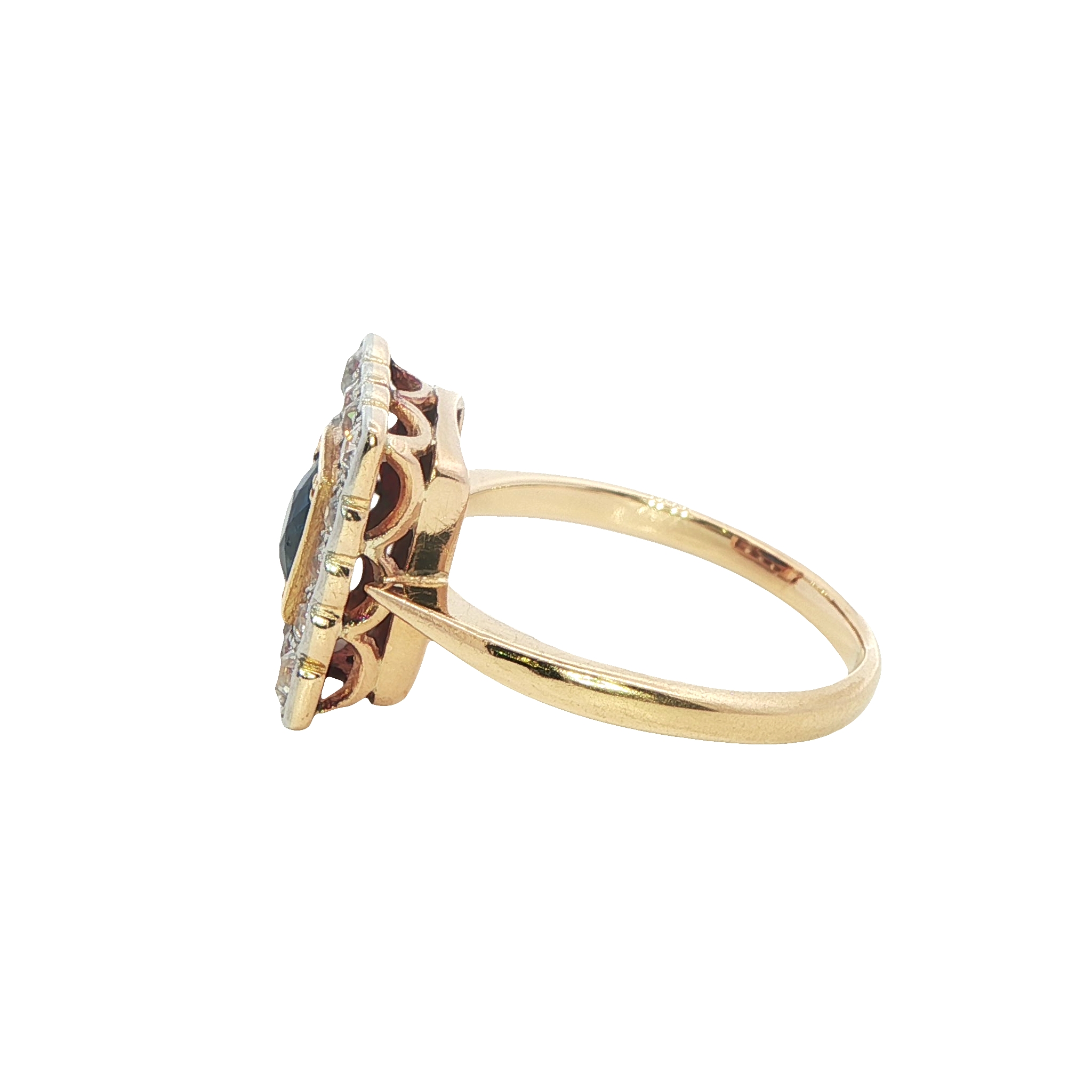 A sparkly vintage 18ct yellow gold ring featuring an oval sapphrie surrouned by old cut diamonds in a grain set halo. A beautiful example of early century jewellery, showcasing delicate stunning and and vivid blue sapphire. Condition: Good, some damage on surface of sapphire in line with age and wear. Era: Early 20th Century Approximate head size: 12.50 x 10.50mm Sapphire: 5.50x4.50mm Weight: 4.32gram Marmalade Revival Jewellery - Peace of Mind All our ‘Revival’ pieces of jewellery are inspected on purchase by our gemmologists and jewellery specialists. and lovingly refurbished, however and characteristically, vintage and antique items may show natural signs wear and tear. As a result, we will endeavour to provide detailed descriptions and highlight any faults beyond normal age-related wear so you can purchase from us with confidence. And because of our inspection and refurbishment, confident to include a 3-month product warranty from the purchase date on all of our pre-owned jewellery. Return for Credit – If for any reason you change your mind, we can offer an exchange or credit note within 3 months, provided the item is unworn and undamaged. And returned in its original condition and packaging.
