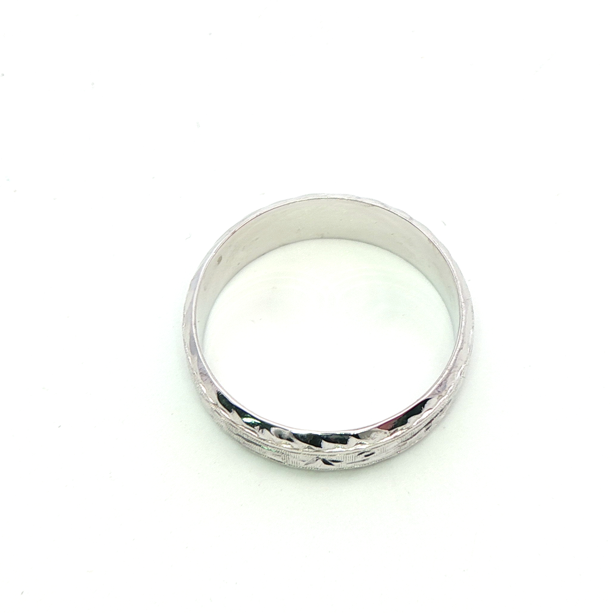 A 18ct white gold wide band with lovely decorative engraving. Ring size: O Condition: Excellent Era: Vintage Weight: 4.76grams Marmalade Revival Jewellery - Peace of Mind All our ‘Revival’ pieces of jewellery are inspected on purchase by our gemmologists and jewellery specialists. and lovingly refurbished, however and characteristically, vintage and antique items may show natural signs wear and tear. As a result, we will endeavour to provide detailed descriptions and highlight any faults beyond normal age-related wear so you can purchase from us with confidence. And because of our inspection and refurbishment, confident to include a 3-month product warranty from the purchase date on all of our pre-owned jewellery. Return for Credit – If for any reason you change your mind, we can offer an exchange or credit note within 3 months, provided the item is unworn and undamaged. And returned in its original condition and packaging.